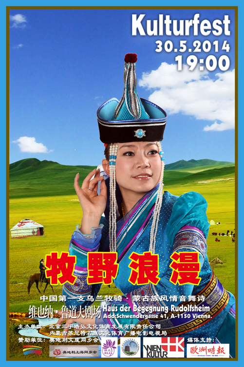 在將于2014年5月30日19點(diǎn)中國第一支烏蘭牧騎在奧地利維也納魯?shù)婪騽?/span>精彩上演蒙古族風(fēng)情音舞詩“牧野浪漫”。烏蘭牧騎將足跡步入奧地利的維也納和薩爾茨堡,將蒙古族音樂的優(yōu)美旋律和舞蹈帶到歐洲這片土壤,這將是一場空前絕后的蒙古族音樂舞蹈視覺盛宴。