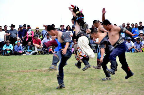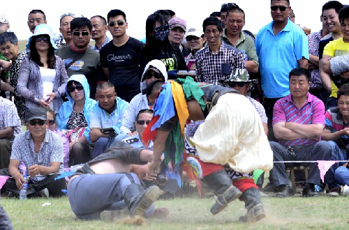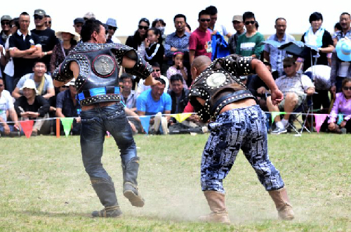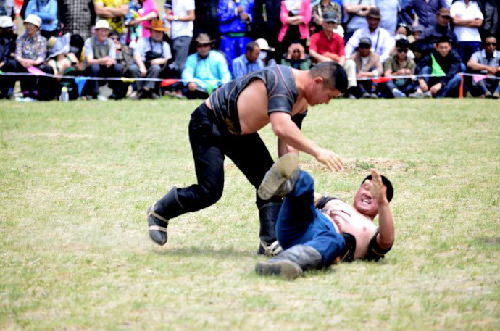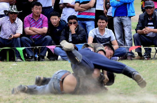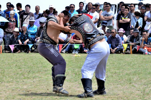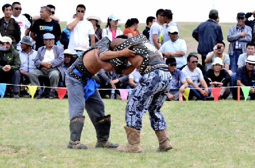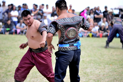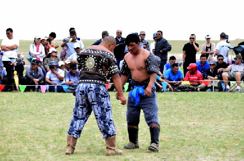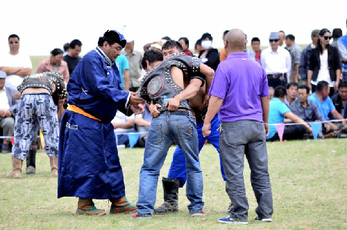 蒙古族的摔跤,既不同于中國(guó)式摔跤,也不同于日本的相撲。蒙古摔跤大體分踢、絆、纏、挑、勾、捉、拉、扯、推、壓等三十余種、三百多個(gè)動(dòng)作。可以抓住摔跤衣、腰帶、褲帶,但不許抱腿,不準(zhǔn)打臉,不準(zhǔn)突然從后背把人拉倒,觸及眼睛和耳朵,不許拉頭發(fā),踢肚子或膝部以上的任何部位,不準(zhǔn)反關(guān)節(jié)動(dòng)作,不能抱腿,不準(zhǔn)扯褲子。蒙古式摔跤以巧取勝,一跤定勝負(fù),膝蓋以上任何部位著地都為失敗。