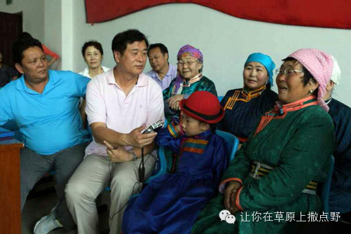 應(yīng)王和聲主任的要求,烏蘭牧騎孟克團(tuán)長(zhǎng)專門請(qǐng)來了七位80多歲的當(dāng)?shù)乩纤嚾?,和?chuàng)作小組進(jìn)行親切 的交談,牧民身穿禮服,演唱了很多傳統(tǒng)的蒙古族原生態(tài)歌曲,如:催奶歌,嫁女歌等優(yōu)美的民間小調(diào),純正的民間唱法深深的打動(dòng)了在場(chǎng)的每一個(gè)人。孟克團(tuán)長(zhǎng)代表烏蘭牧騎的歷屆隊(duì)員,握著王和聲老師的手說:感謝王老師不辭辛苦地來到我們蘇尼特草原,為傳承我們蒙古族文化,深入基層所做出的努力表示深深地感謝。希望王老師寫出更多的像《草原夜色美》一樣的傳世之作。