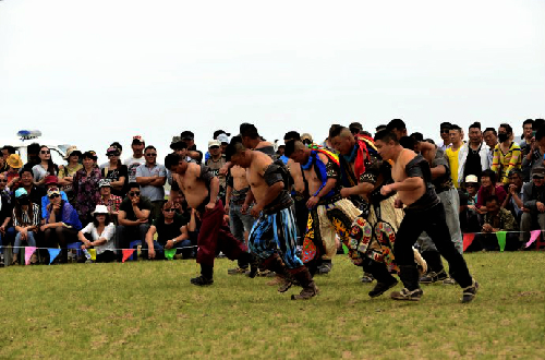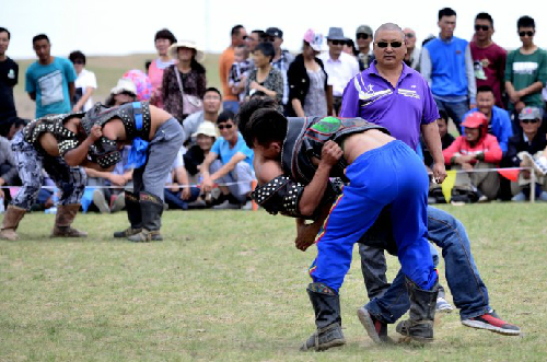 蒙古族的摔跤,既不同于中國(guó)式摔跤,也不同于日本的相撲。蒙古摔跤大體分踢、絆、纏、挑、勾、捉、拉、扯、推、壓等三十余種、三百多個(gè)動(dòng)作。可以抓住摔跤衣、腰帶、褲帶,但不許抱腿,不準(zhǔn)打臉,不準(zhǔn)突然從后背把人拉倒,觸及眼睛和耳朵,不許拉頭發(fā),踢肚子或膝部以上的任何部位,不準(zhǔn)反關(guān)節(jié)動(dòng)作,不能抱腿,不準(zhǔn)扯褲子。蒙古式摔跤以巧取勝,一跤定勝負(fù),膝蓋以上任何部位著地都為失敗。