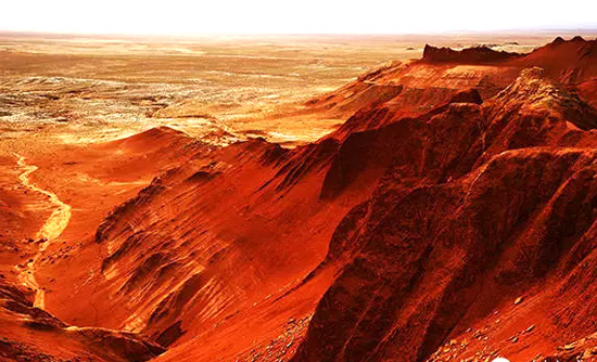 呈火星地貌景象。茫茫戈壁,拔地而起。形貌綺麗,蔚然可觀。頂部寬而平坦,乘駝躍馬,十分浪漫。